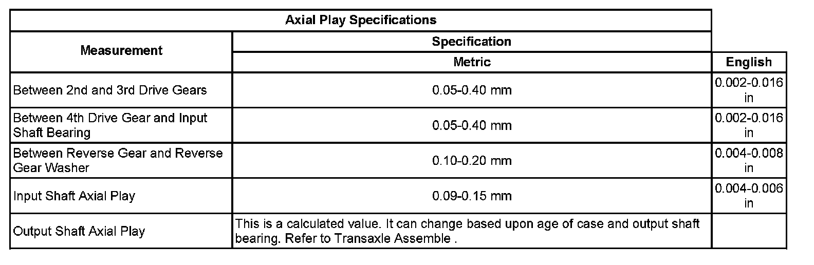 Axial Play Specifications: