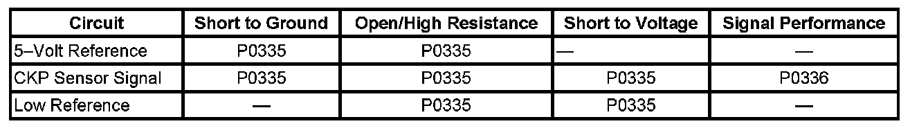 * The ECM detects that the starter is commanded on and the engine has been cranking for more than 4 seconds without a CKP sensor pulse.
