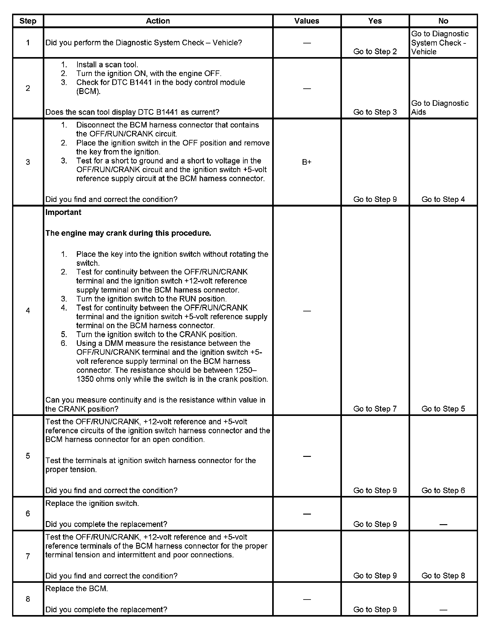 The body control module (BCM) monitors the OFF/RUN/CRANK signal from the ignition switch. The signal is zero when there is no key in the ignition cylinder. The signal is at the 12-volt reference level when a key is placed into the ignition cylinder. When the vehicle operator places the ignition switch in the Run position, the switch supplies +5 volts to the BCM OFF/RUN/CRANK input terminal. During a crank event, the +5 volt signal is passed through an internal resistor in the ignition switch for discrimination of the crank command. If the OFF/RUN/CRANK circuit becomes shorted to B+, ground or the circuit opens, DTC B1441 will set.