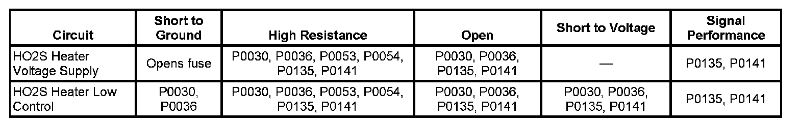 The ECM monitors the voltage on the HO2S heater low control circuit for heater fault diagnosis. If the ECM detects that the HO2S heater low control circuit voltage is not within a specified range, DTC P0030 sets for HO2S 1, or DTC P0036 sets for HO2S 2.