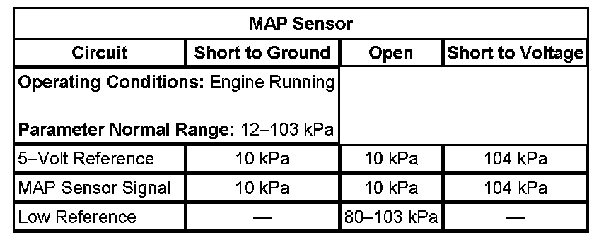 Under normal operation the greatest pressure that can exist in the intake manifold is equal to BARO. This occurs when the vehicle is operated at wide-open throttle (WOT) or when the ignition is on while the engine is off. Under these conditions, the ECM uses the MAP sensor to determine the current BARO. The least manifold pressures occur when the vehicle is idling or decelerating. MAP can range from 12 kPa, when pressures are less, to as great as 103 kPa, depending on the current BARO. The ECM monitors the MAP sensor signal for pressure outside of the normal range.