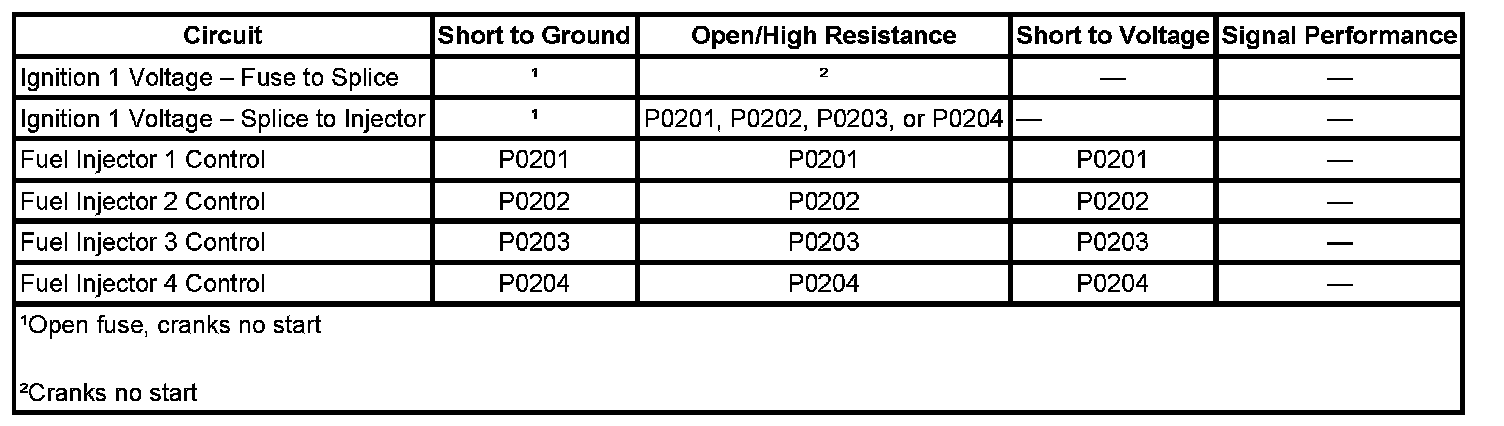 The control module enables the appropriate fuel injector pulse for each cylinder. Ignition voltage is supplied to the fuel injectors. The control module controls each fuel injector by grounding the control circuit via a solid state device called a driver. The control module monitors the status of each driver. If the control module detects an incorrect voltage for the commanded state of the driver, a fuel injector control circuit DTC sets.