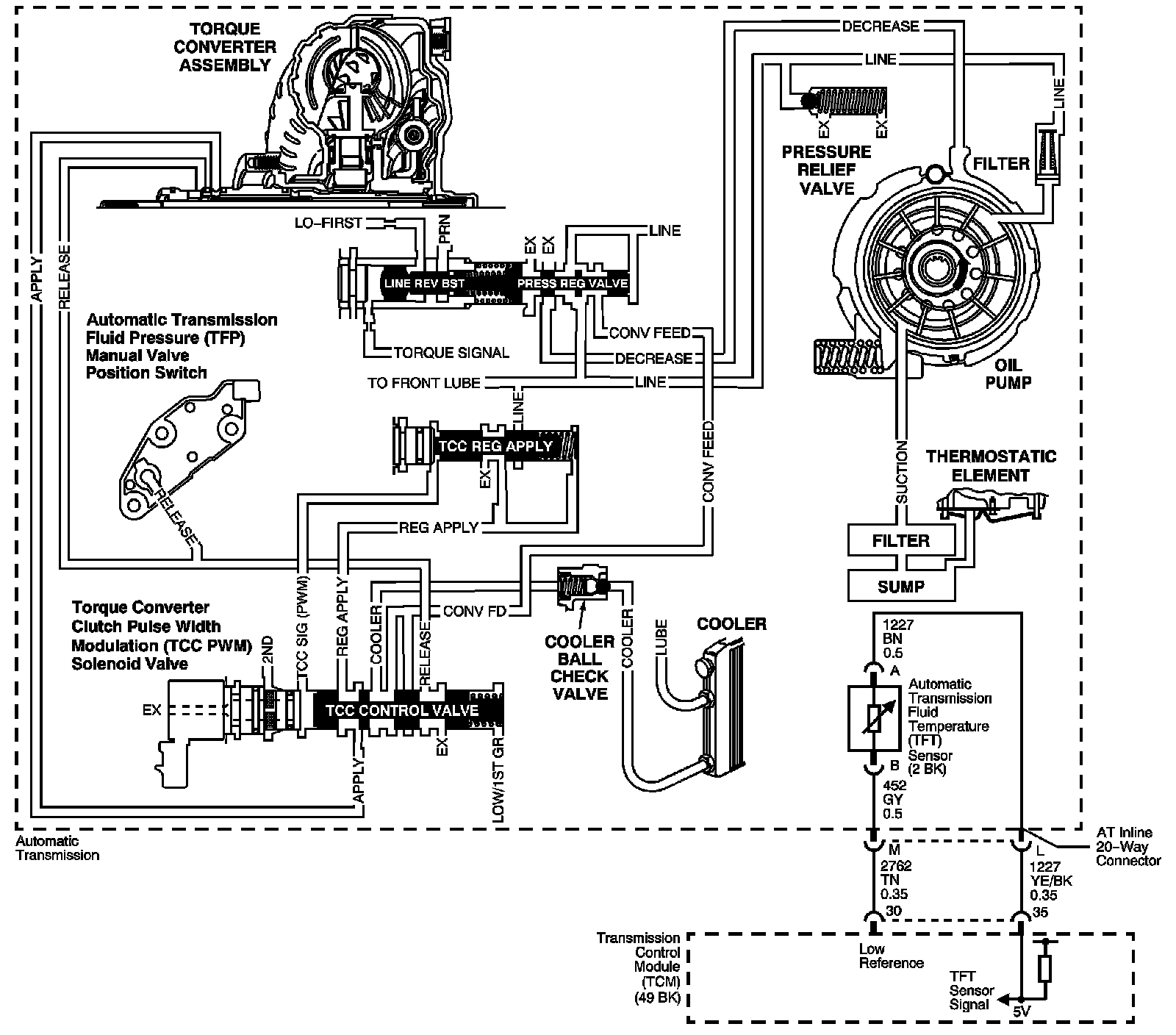 Hot fluid from the torque converter flows through the torque converter clutch (TCC) control valve into the cooler lines to the oil cooler located in the vehicle radiator and auxiliary cooler, if equipped. Cool fluid then returns to lubricate the final drive assembly and other components along the output shaft.