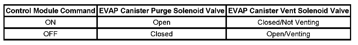 The control module tests the evaporative emission (EVAP) system for a large leak. The control module monitors the fuel tank pressure (FTP) sensor signal to determine the EVAP system vacuum level. When the conditions for running are met, the control module commands the EVAP canister purge solenoid valve OPEN and the EVAP vent solenoid valve CLOSED. This allows engine vacuum to enter the EVAP system. At a calibrated time, or vacuum level, the control module commands the EVAP canister purge solenoid valve closed, sealing the system, and monitors the FTP sensor input in order to determine the EVAP system vacuum level. The table illustrates the relationship between the ON and OFF states, and the OPEN or CLOSED states of the EVAP canister purge and vent solenoid valves.