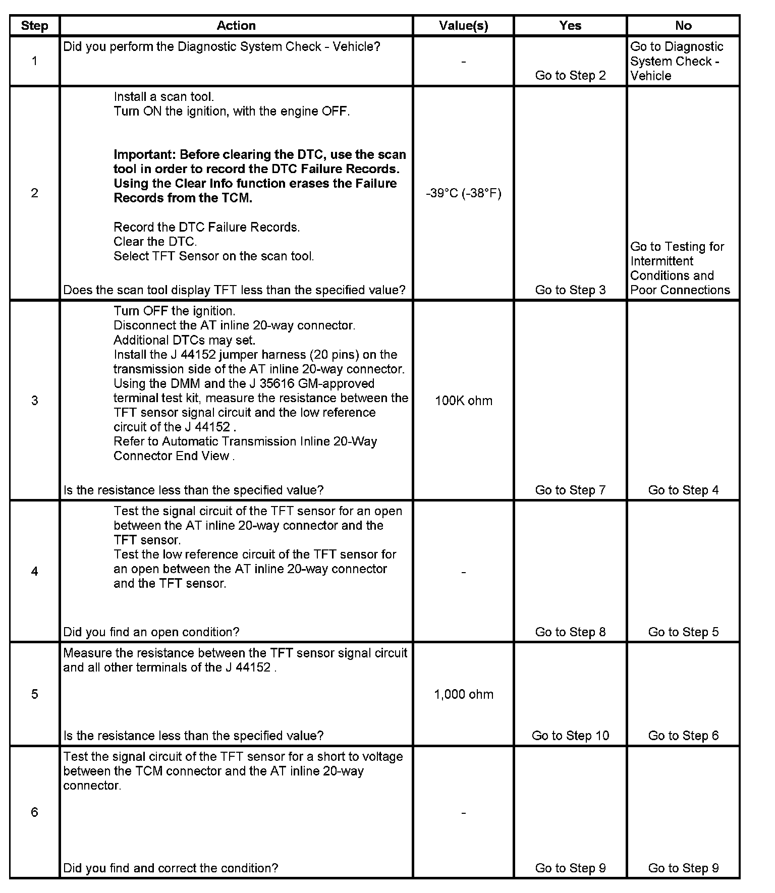 5. This step tests the TFT sensor signal circuit for being shorted to another circuit within the transmission. If the TFT sensor signal circuit shorts to another circuit, which is carrying voltage greater than five volts, the TFT sensor would become open.