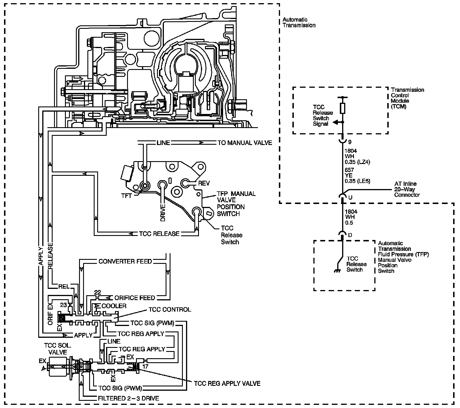 The TCC release switch is part of the automatic transmission fluid pressure (TFP) manual valve position switch. The TFP manual valve position switch is attached to the control valve body.