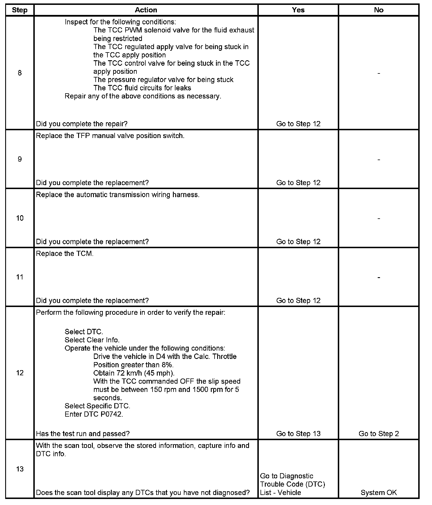 When the TCM detects that the TCC release switch is closed when the TCC is commanded OFF, then DTC P0742 sets. DTC P0742 is a type B DTC.