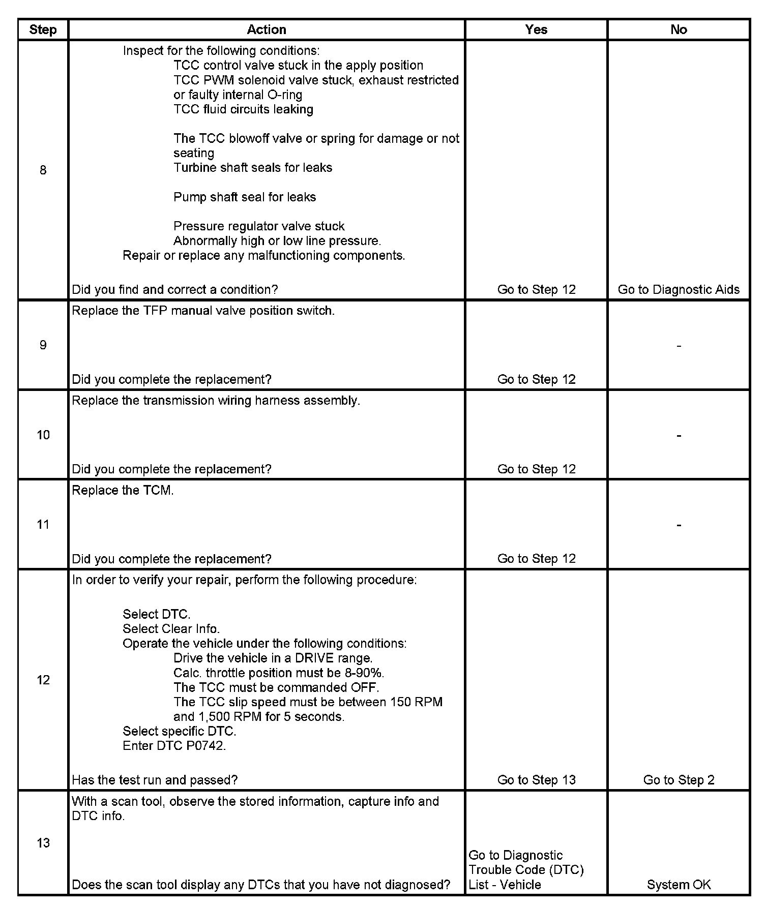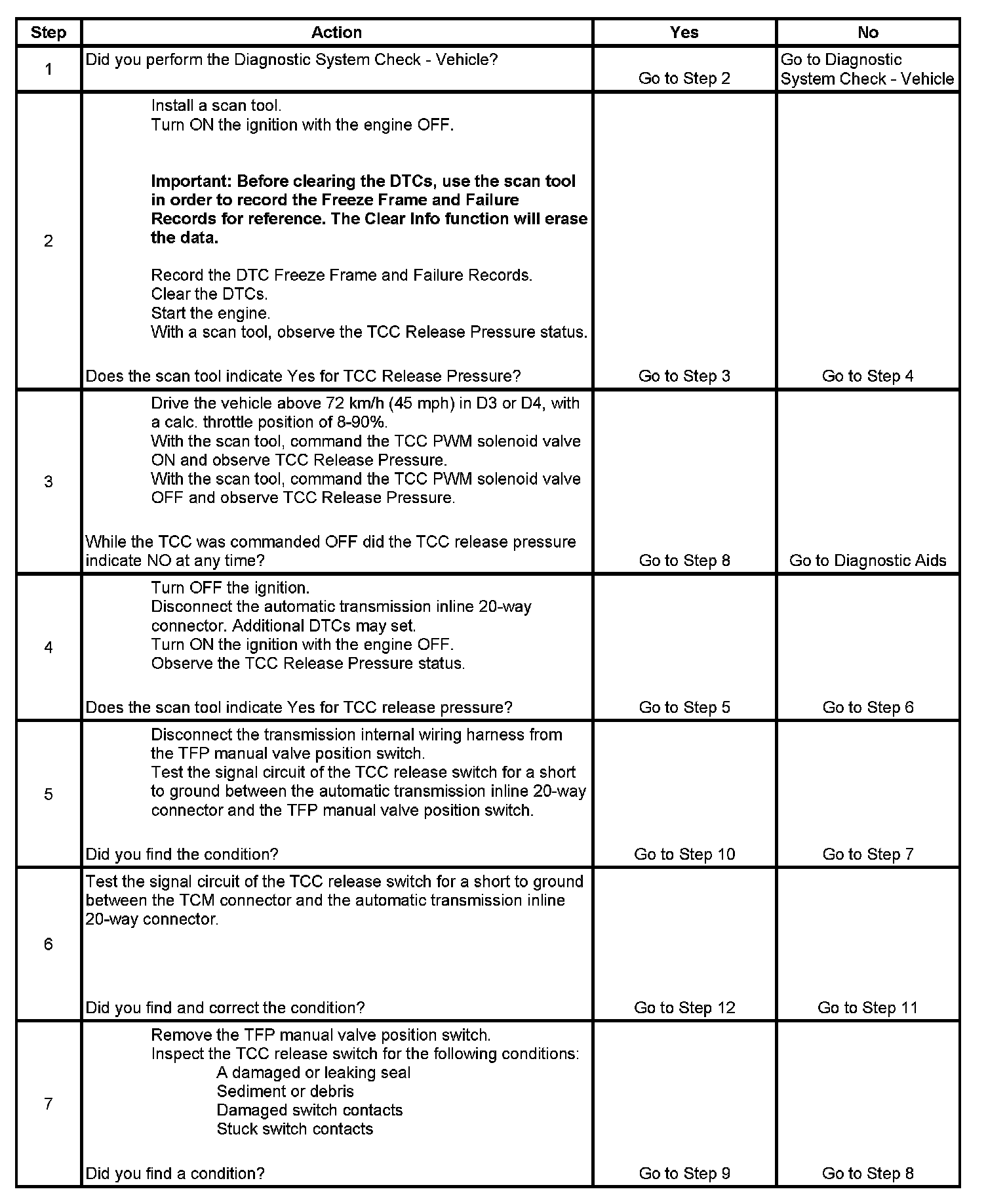 ^ If the scan tool indicated TCC release pressure was present in Step 2 and a mechanical or hydraulic condition was not found in Step 8, an intermittent short to ground condition may exist in the TCC release switch signal circuit. Refer to Testing for Intermittent Conditions and Poor Connections. Component Tests and General Diagnostics