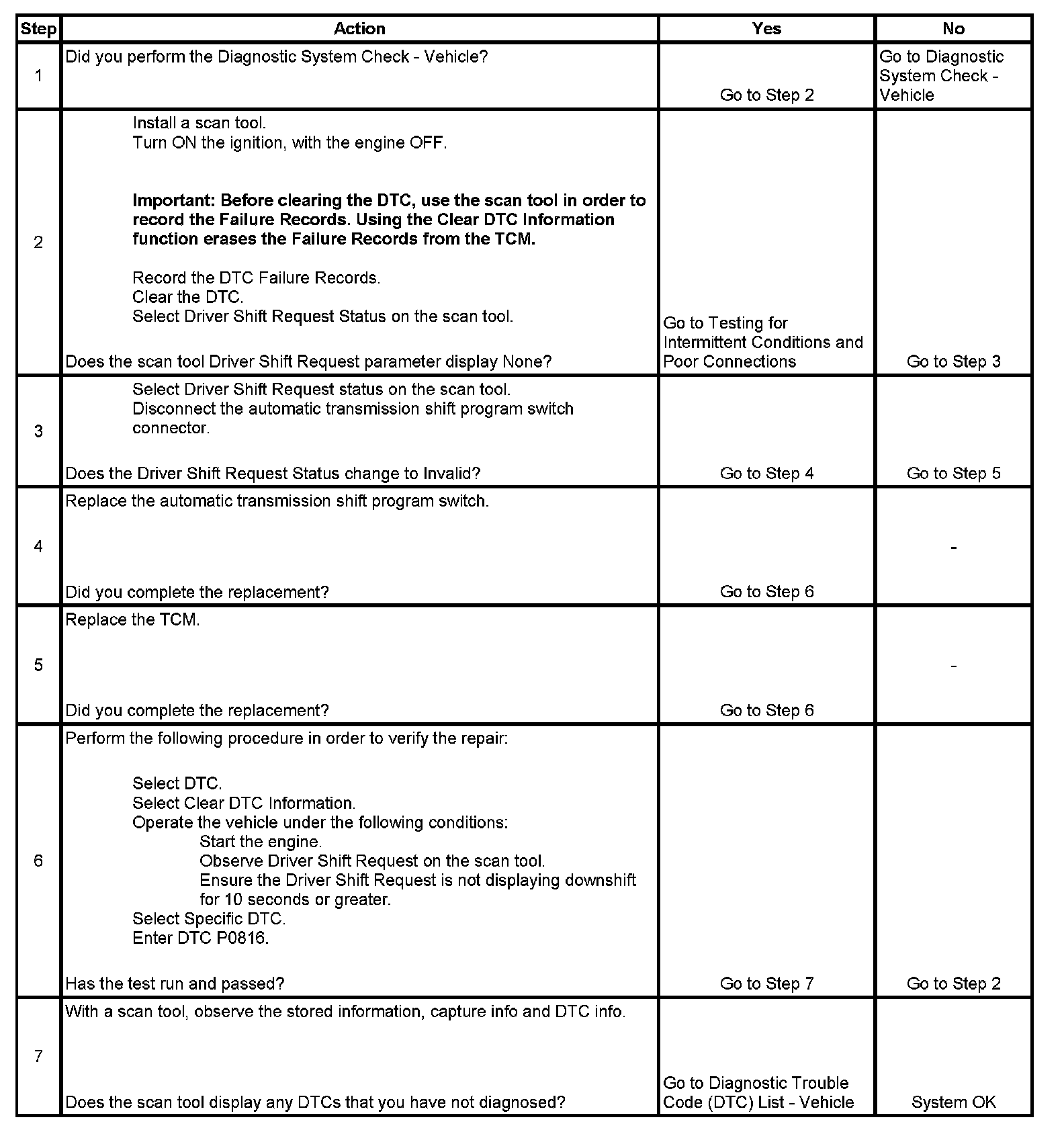 If the transmission control module (TCM) detects the downshift circuit active for an extended period of time, then DTC P0816 sets. DTC P0816 is a type C DTC.