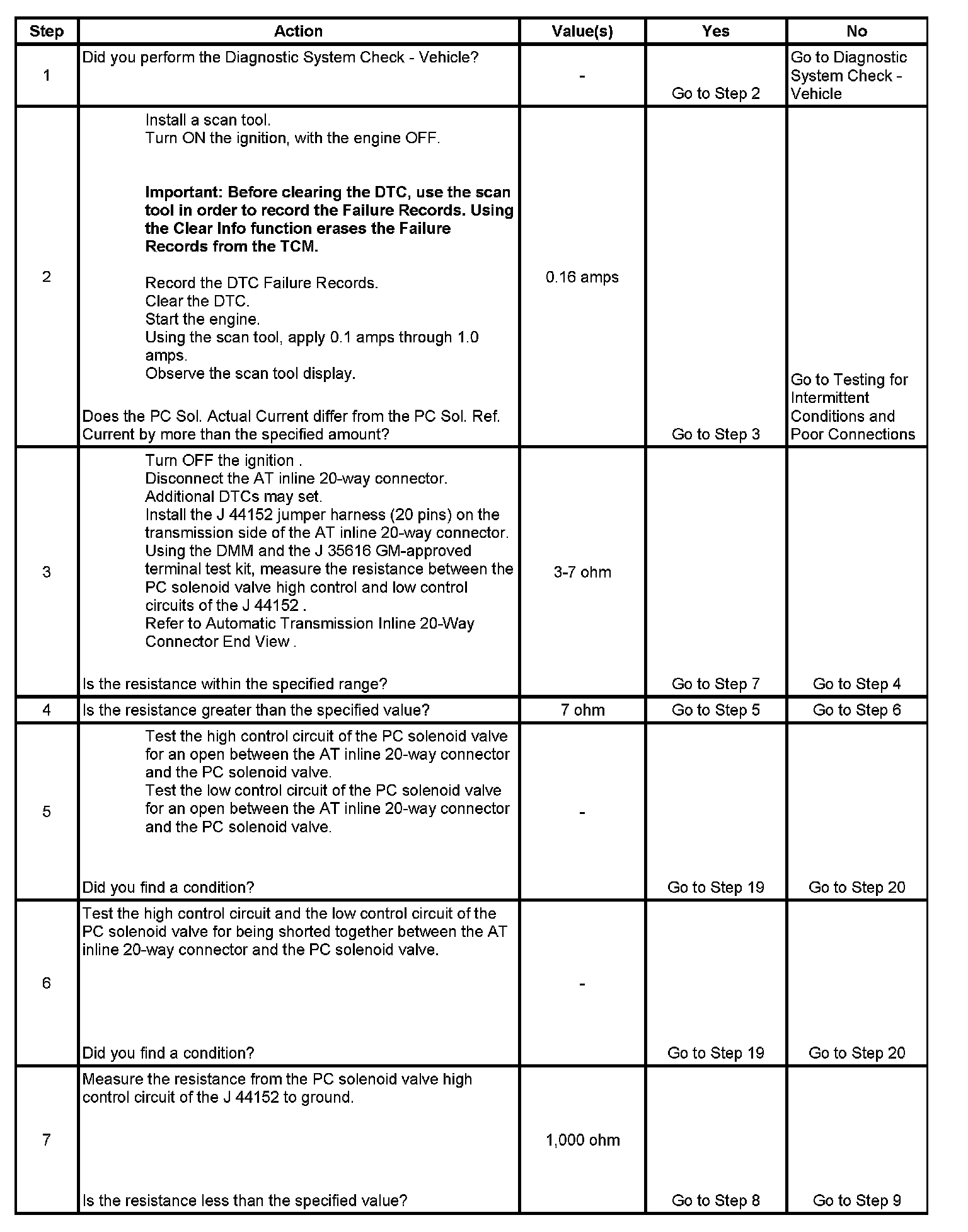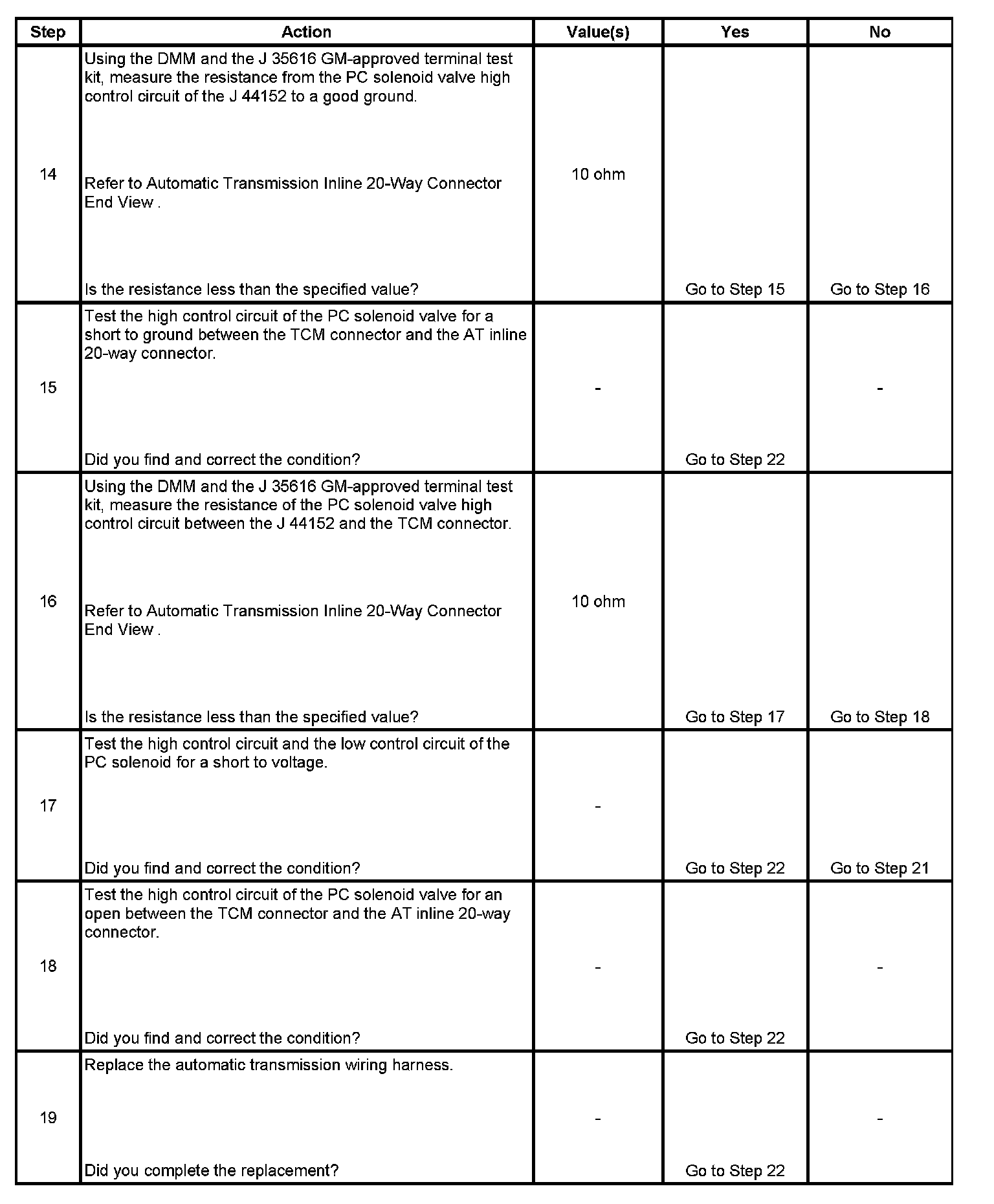 3. This step verifies that the automatic transmission wiring harness and the PC solenoid valve have correct resistance.