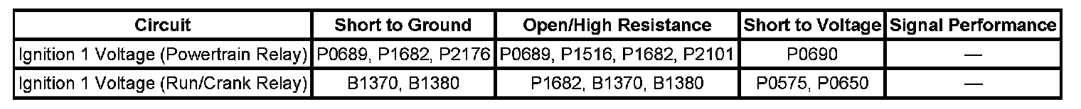 The ignition 1 voltage of the Run/Crank relay is more than 3 volts different than the ignition 1 voltage of the powertrain relay for more than 2 seconds.
