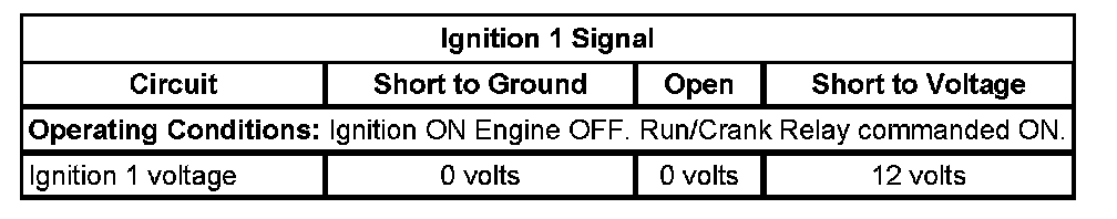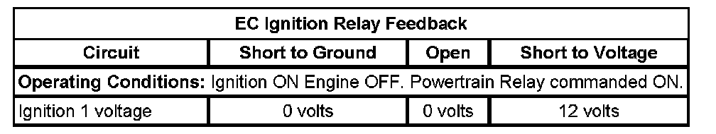 2. Ignition ON, engine OFF, observe the Ignition 1 voltage signal, and the EC Ignition Relay Feedback signal parameters, on the scan tool. Both parameter values should display no more than 3 volts difference, between the two parameters.