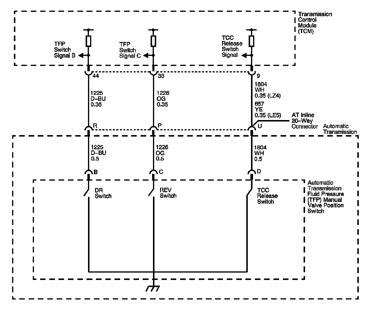 The transmission control module (TCM) provides battery voltage on the two range signal circuits. By grounding one or more of the switches with fluid pressure from the manual shift valve, the TCM detects the selected gear range. When you disconnect the transmission electrical connector and the ignition is ON, the ground potential for the range signals from the TCM will be removed, and an invalid gear range will be indicated. Refer to Transmission Fluid Pressure Manual Valve Position Switch Logic.