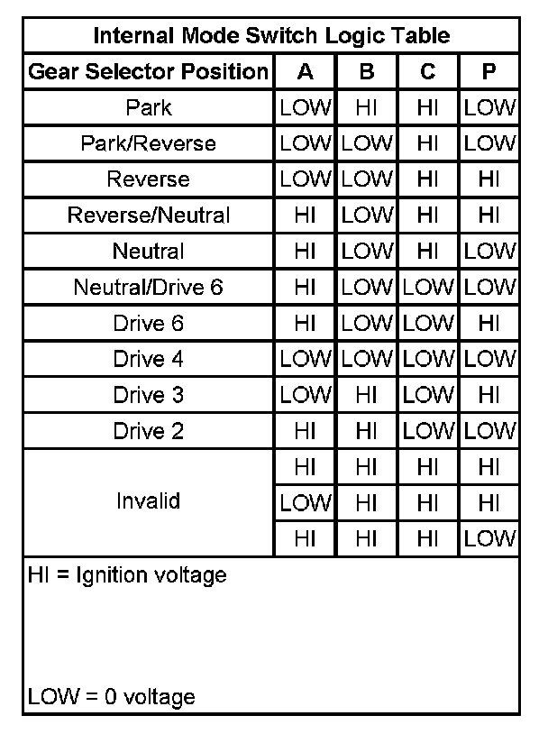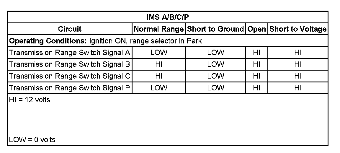 The internal mode switch (IMS) assembly is a sliding contact switch attached to the control valve body within the transmission. The 4 inputs to the transmission control module (TCM) from the switch indicate which position is selected by the transmission manual shaft. The input voltage at the TCM is high when the switch is open and low when the switch is closed to ground. The state of each input is displayed on the scan tool as IMS. The IMS input parameters represented are transmission range signal A, Signal B, signal C, and signal P.