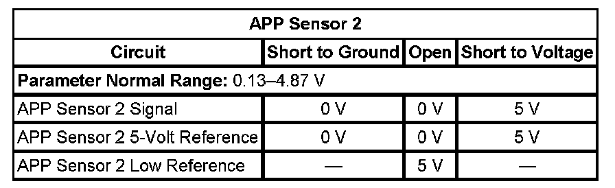- Accelerator Pedal Position (APP) Sensor 2 Circuit Low Voltage