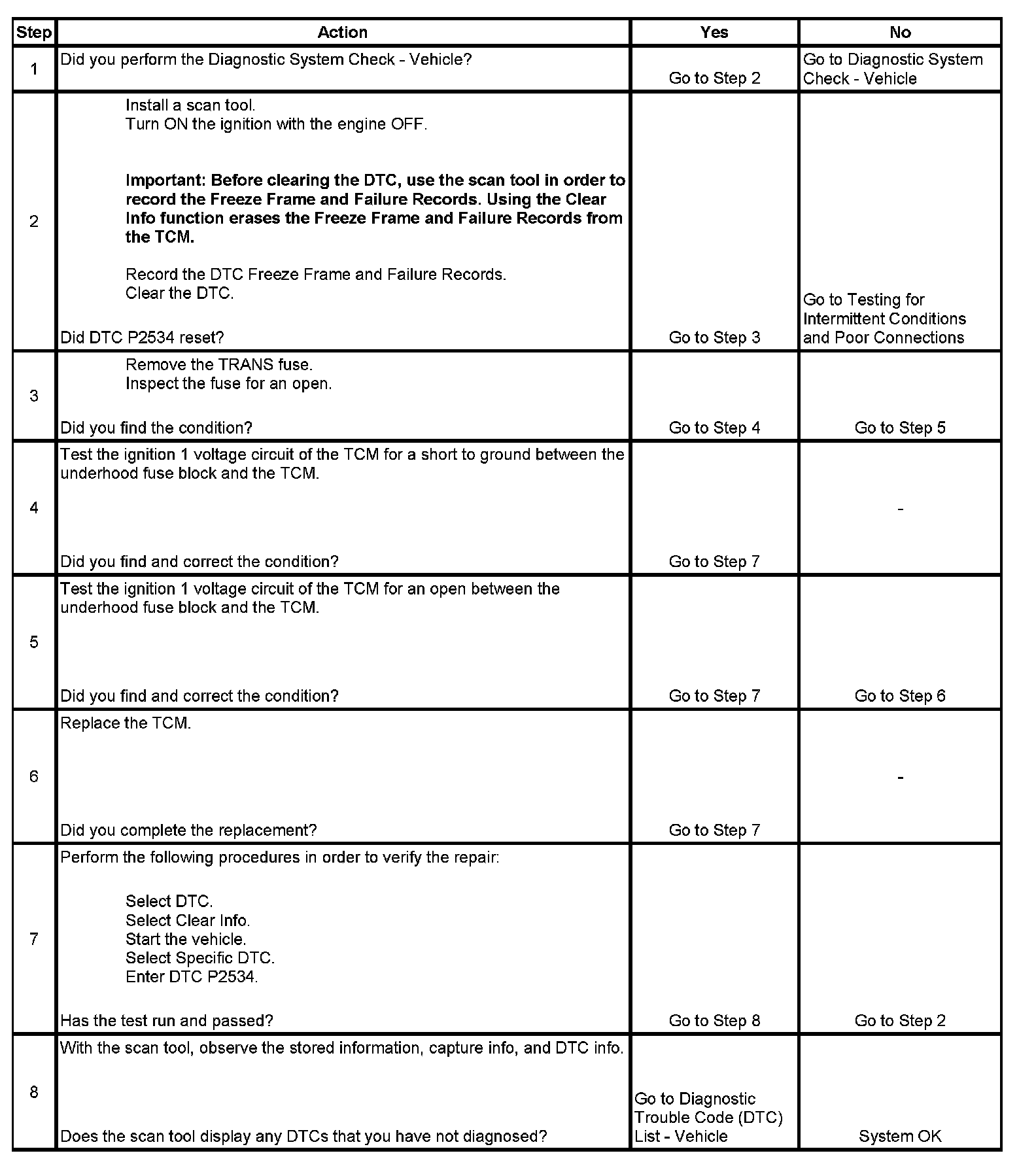 If the TCM detects low voltage on the Ignition 1 voltage circuit, DTC P2534 sets. DTC P2534 is a type A DTC.
