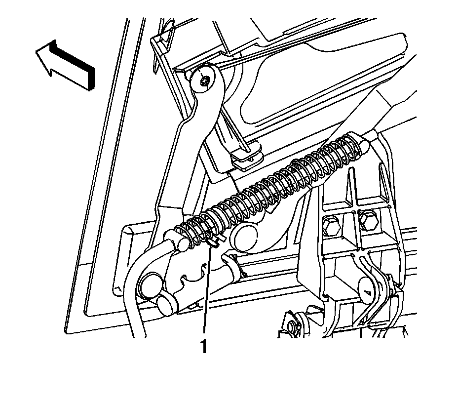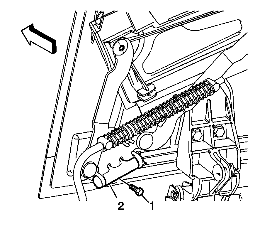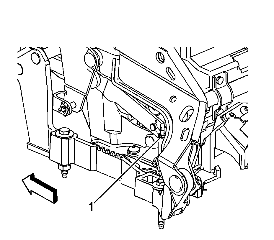 2. Adjust the stop (1) located on the underside of the front stowage compartment closeout panel link assembly. Refer to Roof Retractable Stowage Compartment Closeout Panel Actuator Cable Replacement. 3. Carefully cycle the folding top, inspecting for proper operation and alignment of the storage compartment closeout panel.