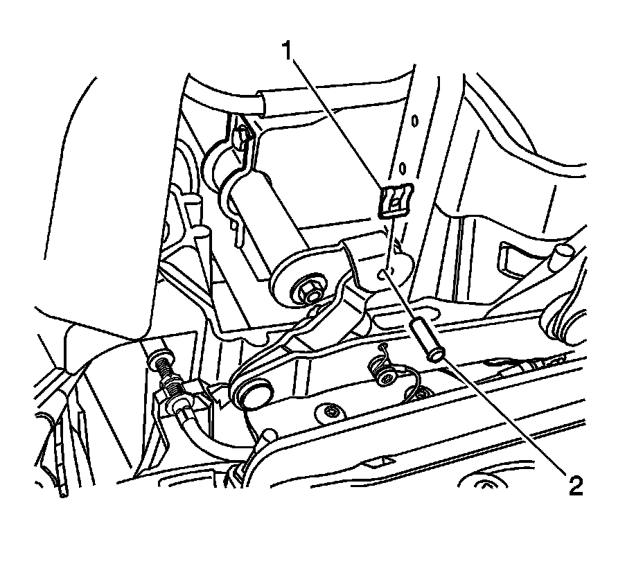 7. Install the pins (1) and clips (2) retaining the folding top stowage compartment closeout panel link drive rod to the right and left folding top side rail link arms.