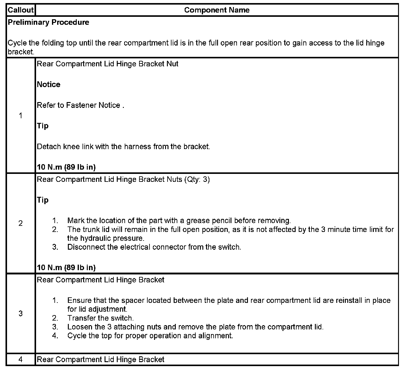 REAR COMPARTMENT LID HINGE BRACKET REPLACEMENT - LID SIDE