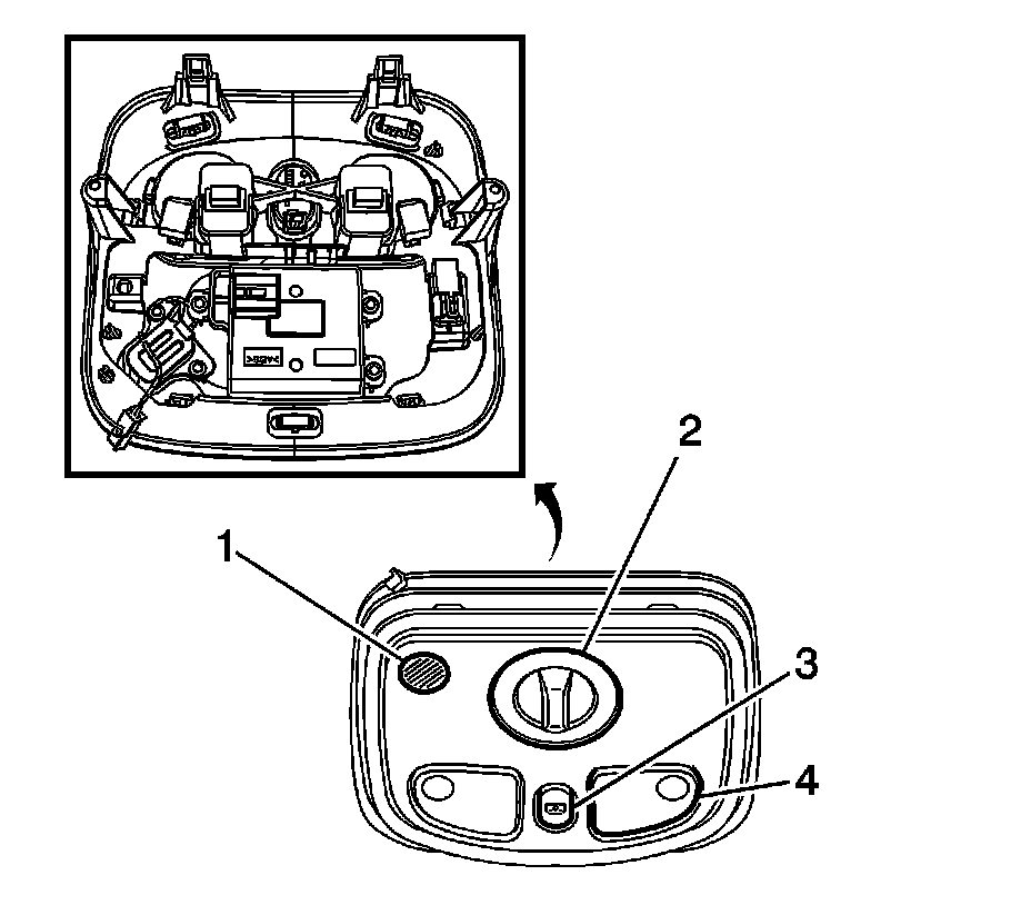 3. Use a small flat bladed tool to release the sunshade switch (3) from the overhead console cover.
