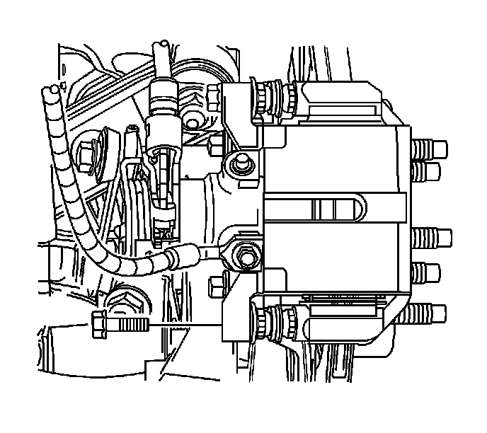 Notice: Support the brake caliper with heavy mechanic wire, or equivalent, whenever it is separated from its mount and the hydraulic flexible brake hose is still connected. Failure to support the caliper in this manner will cause the flexible brake hose to bear the weight of the caliper, which may cause damage to the brake hose and in turn may cause a brake fluid leak.