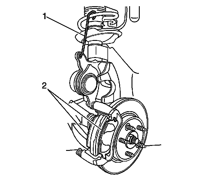 Notice: Support the brake caliper with heavy mechanic wire, or equivalent, whenever it is separated from its mount and the hydraulic flexible brake hose is still connected. Failure to support the caliper in this manner will cause the flexible brake hose to bear the weight of the caliper, which may cause damage to the brake hose and in turn may cause a brake fluid leak.