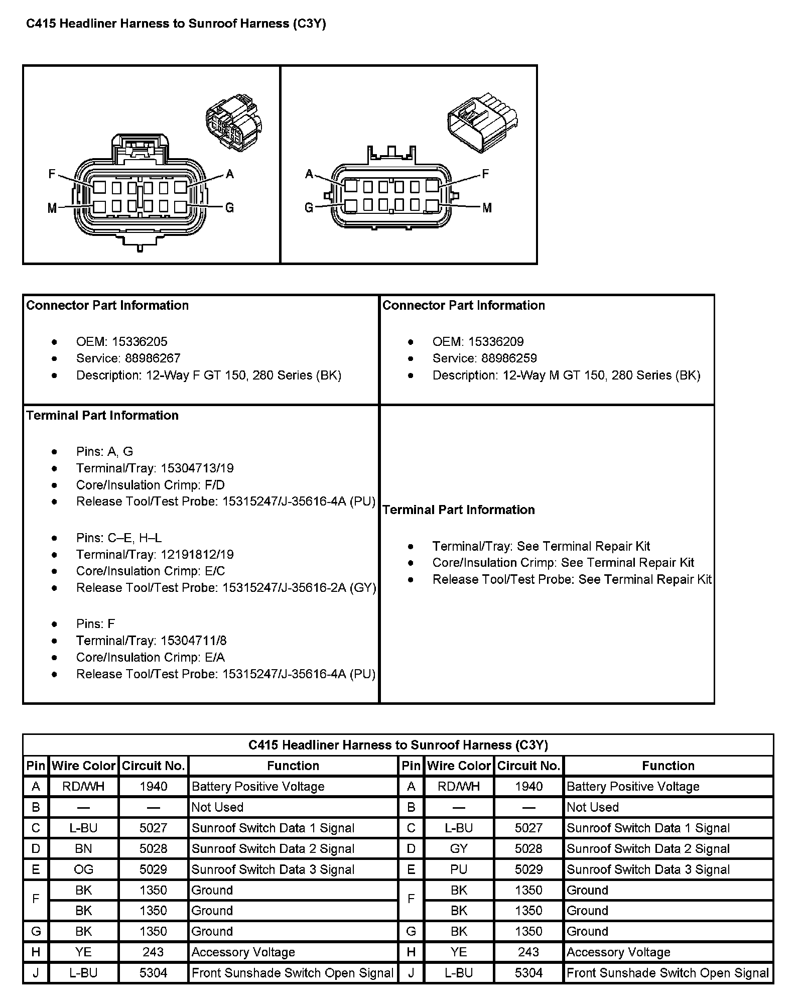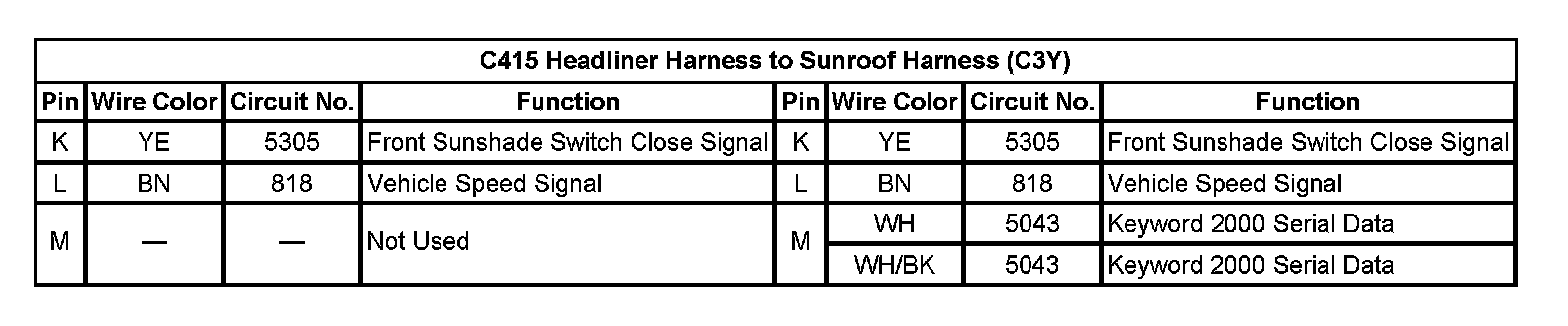 C415 Headliner Harness To Sunroof Harness (With RPO Code C3Y) (Pin K To M):