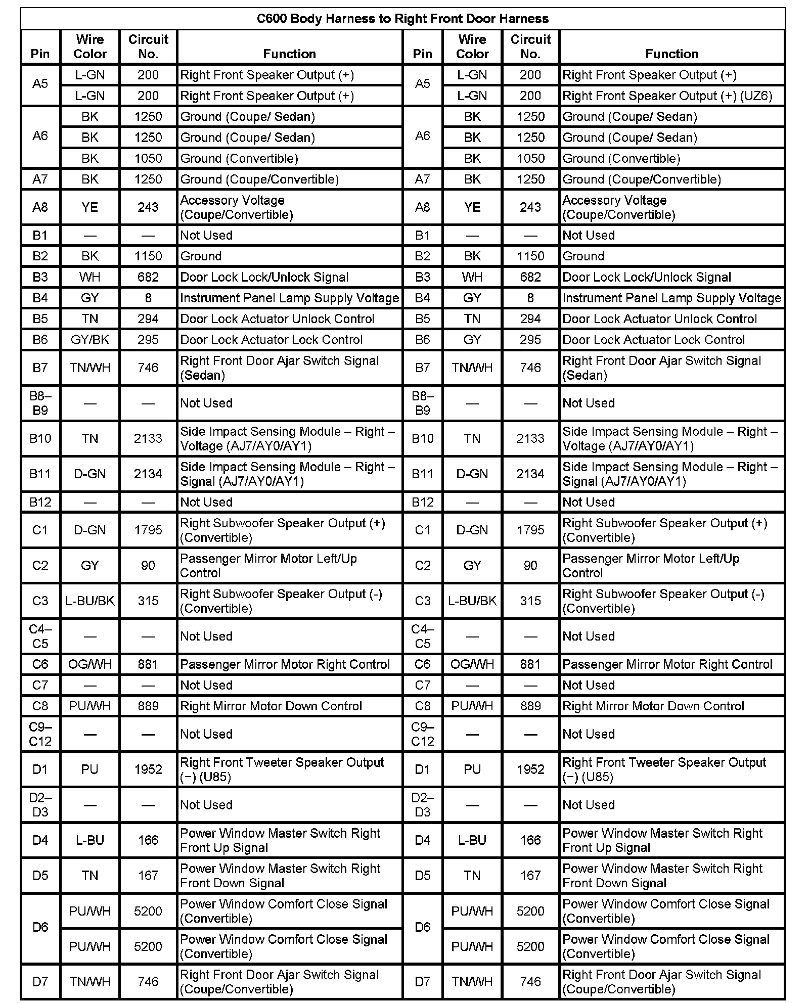 C600 Body Harness To Right Front Door Harness (Pin A5 To D7):