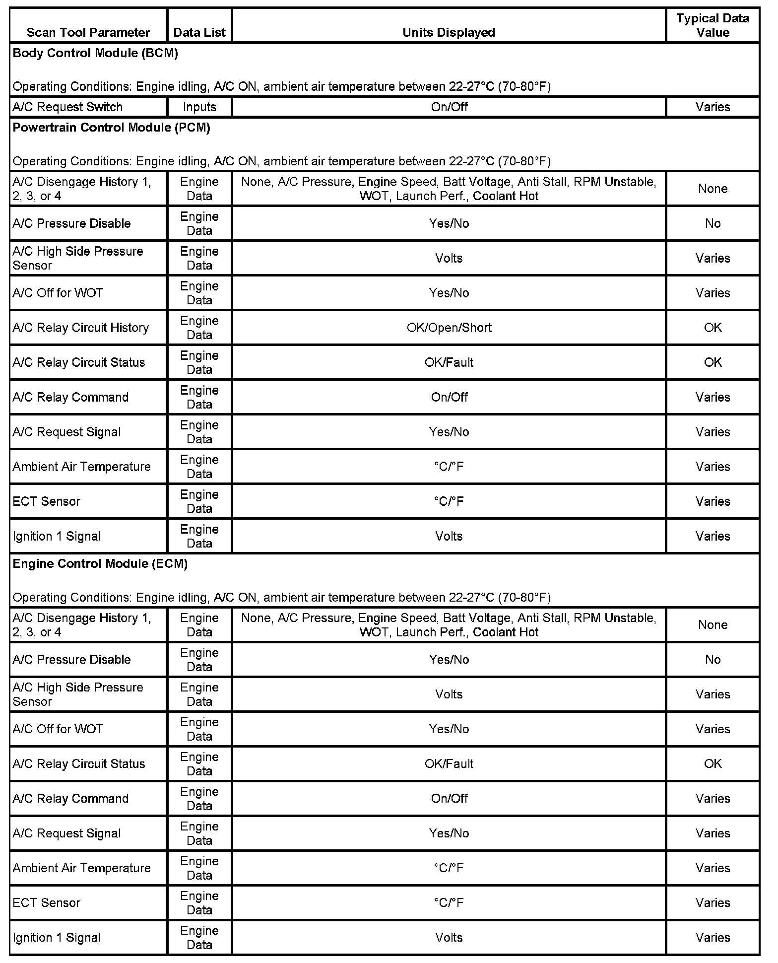 The scan tool data values were taken from a known good vehicle under the following conditions: