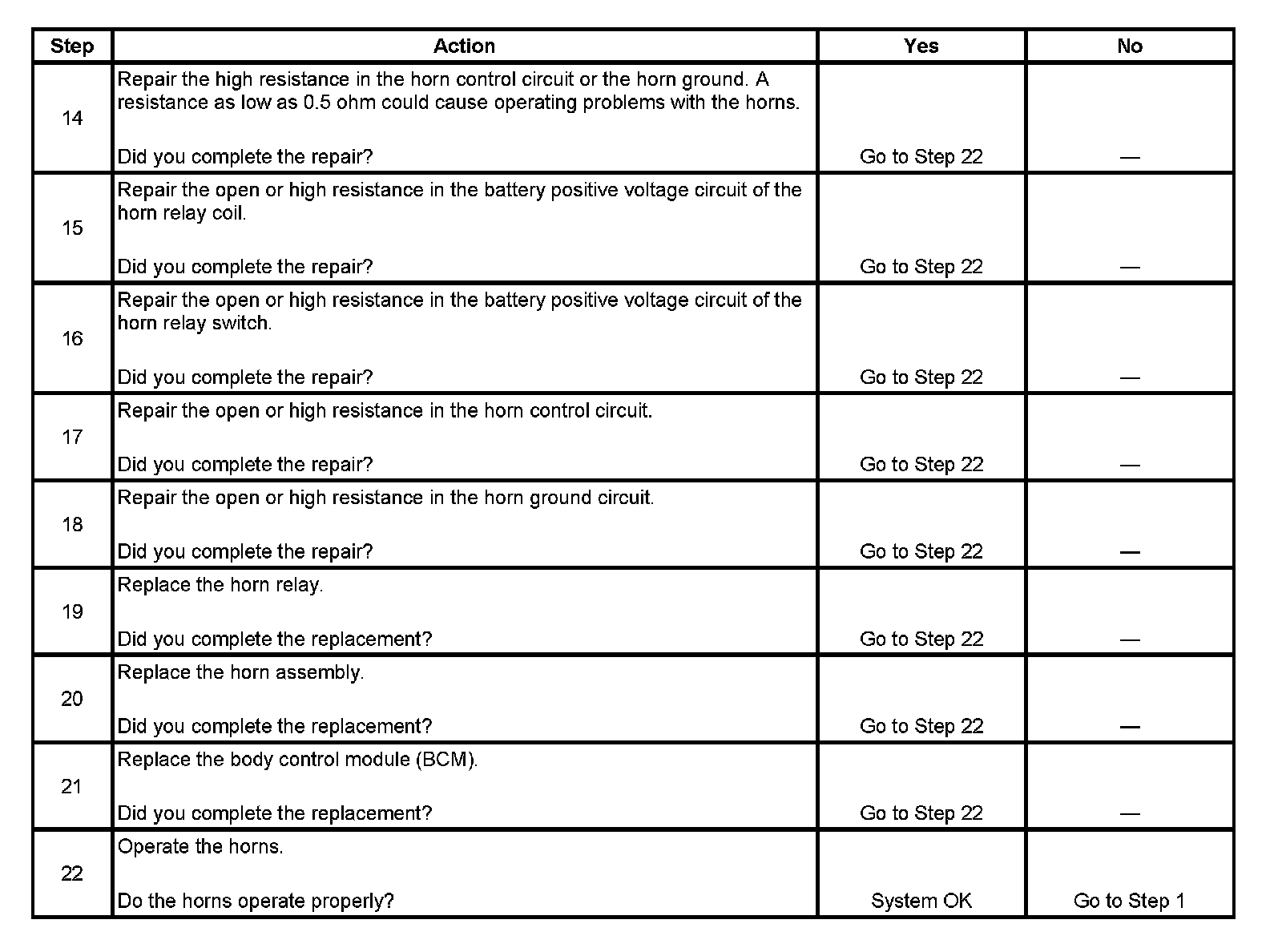 14. The horns need maximum current flow to operate properly. A high resistance, greater than 0.5 ohm, in the horn control circuit or the horn ground circuit could cause operating problems with the horns. Inspect the circuits for faults that would restrict current flow.