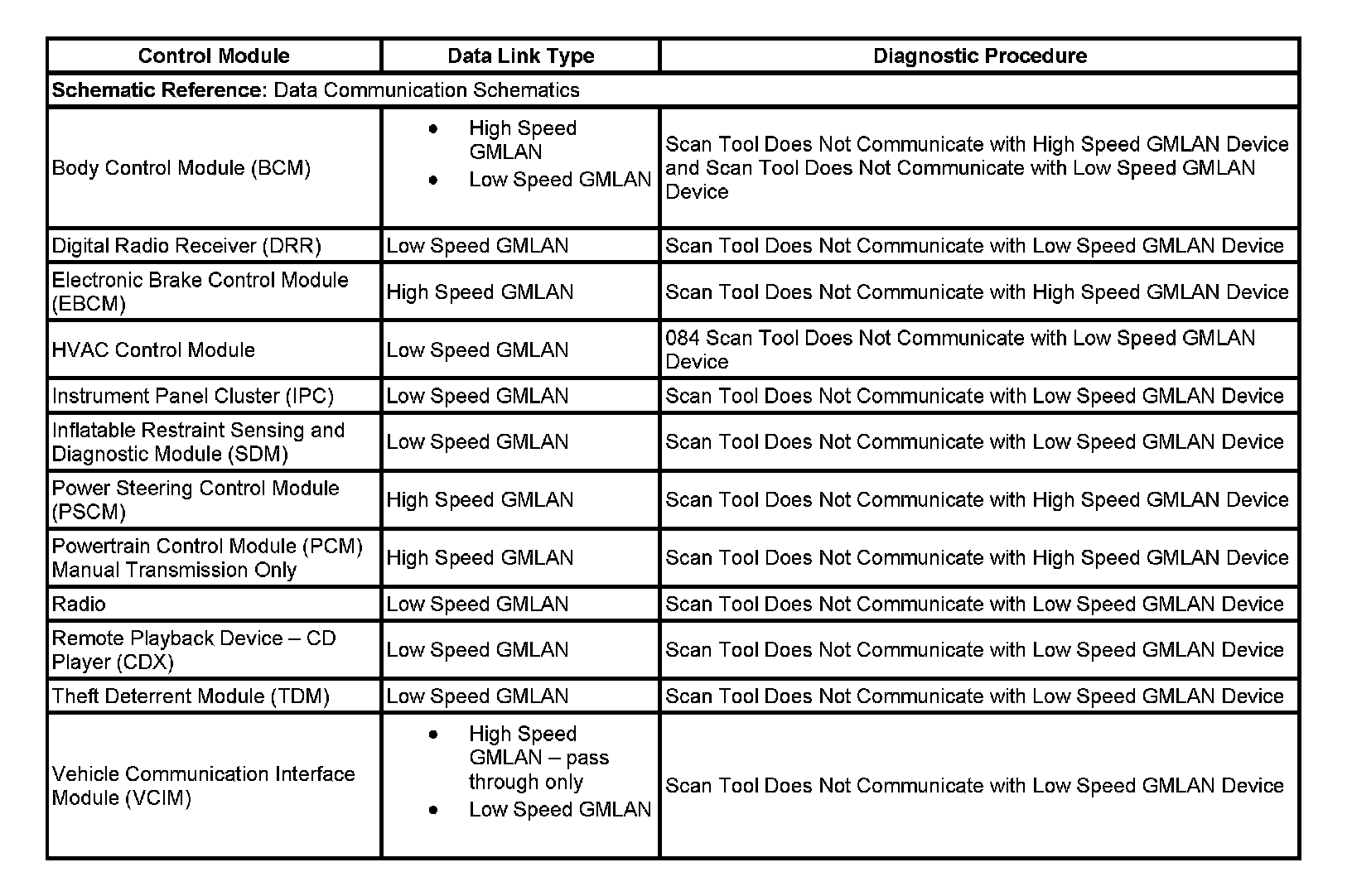 This table identifies which serial data link that a particular module uses for in-vehicle data transmission. Some modules may use more than one data link to communicate. Some modules may have multiple communication circuits passing through them without actively communicating on that data link. This table is used to assist in correcting a communication malfunction. For the description and operation of these serial data communication circuits, refer to Data Link Communications Description and Operation.