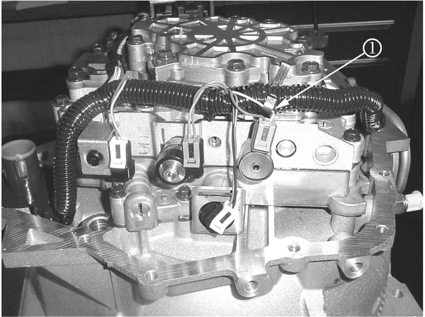 The tan wire (1) of the Torque Converter Clutch (TCC) Solenoid Valve harness may be incorrectly routed around a metal retaining clip causing a chafe in the wire insulation, resulting in a short to ground. The harsh shift concern is due to the default code causing high line pressure to be commanded.