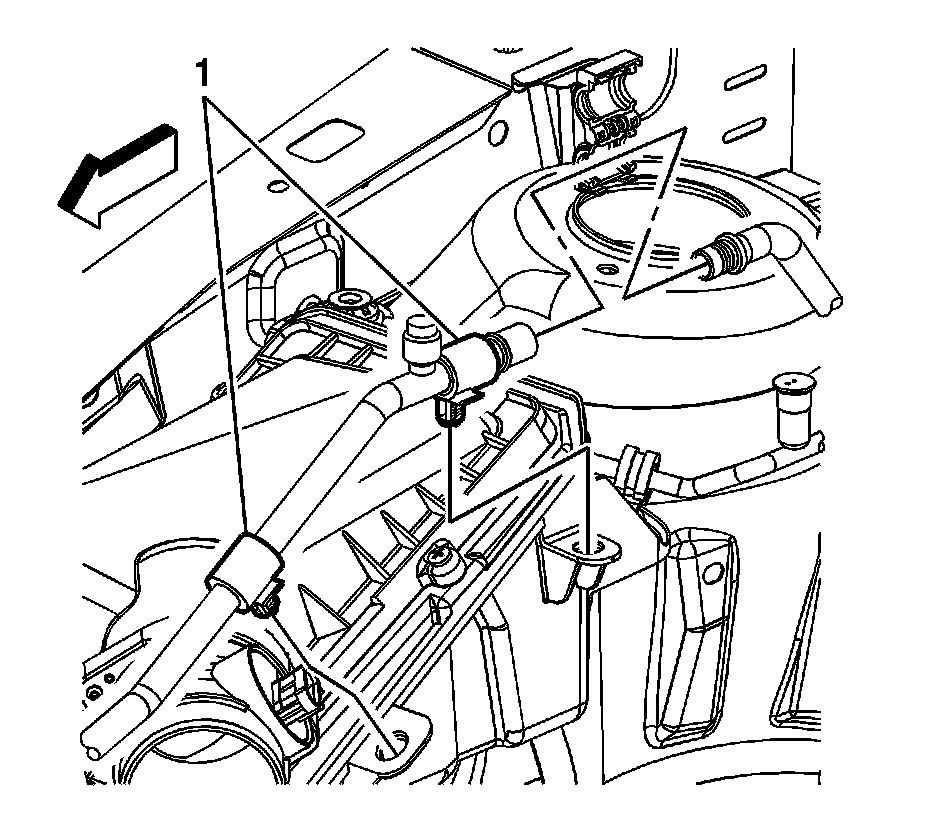 3. Remove the air conditioning (A/C) line clips (1) from the air cleaner tabs.