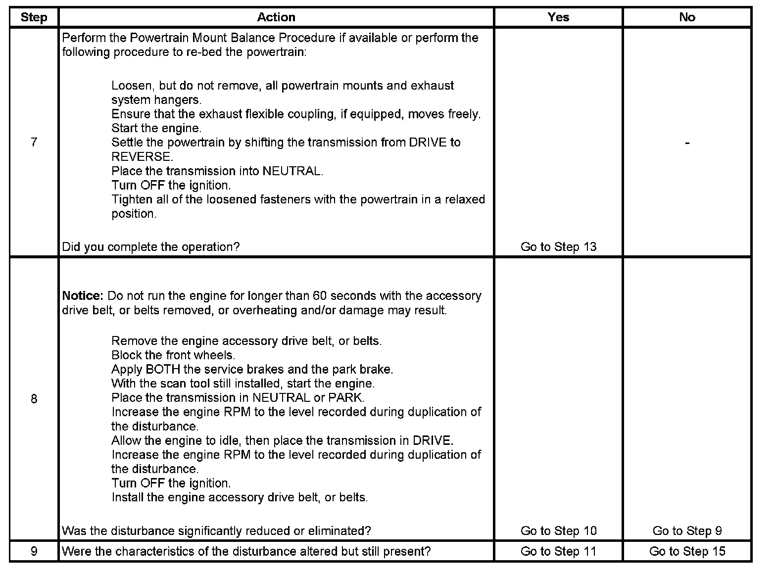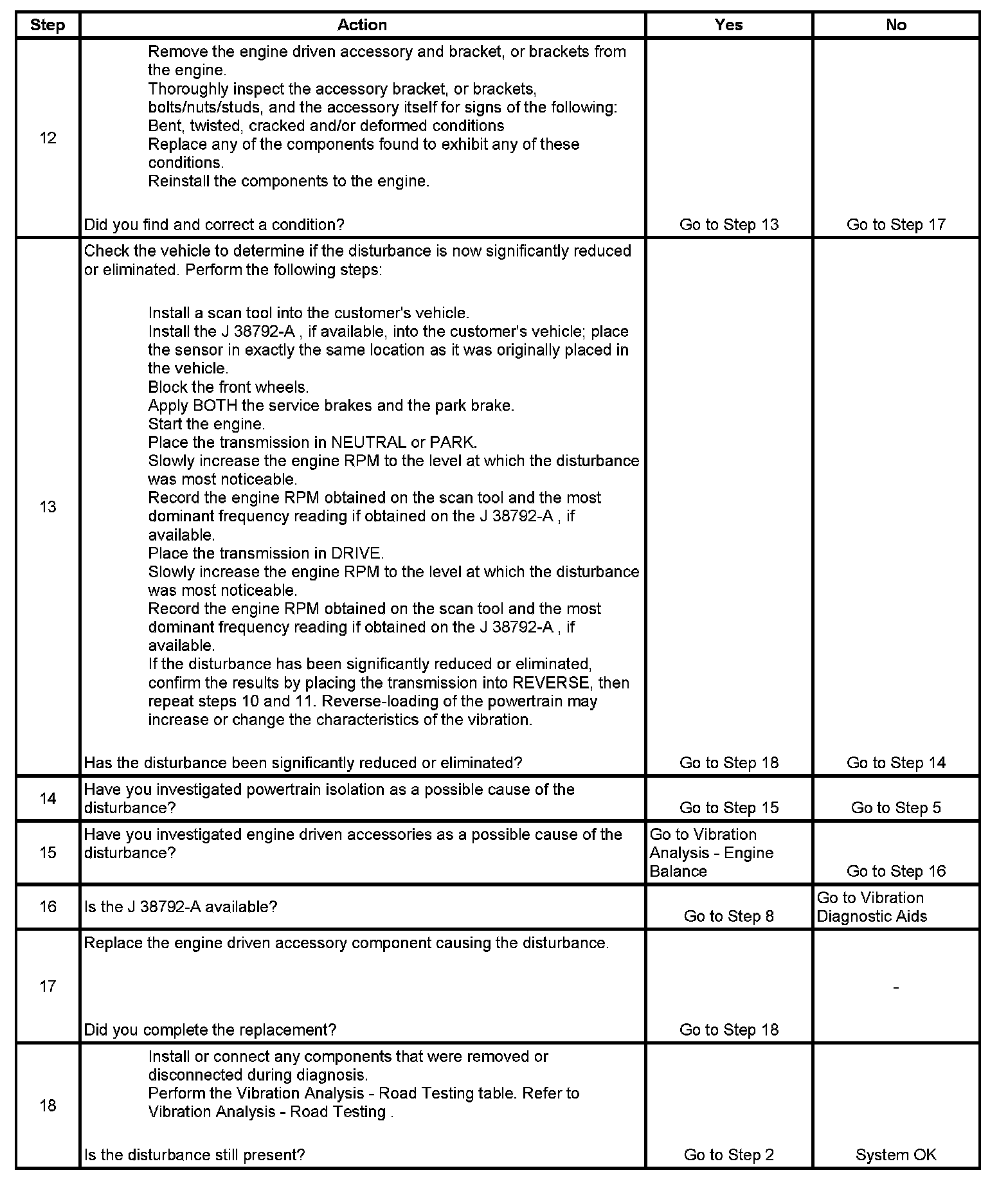 9. Non-rotating engine driven accessory components can no longer produce a unique disturbance. If a disturbance is still present, but the characteristics have been altered, it is possible that these component systems are acting as a transfer path for engine firing frequency or a first order engine disturbance.