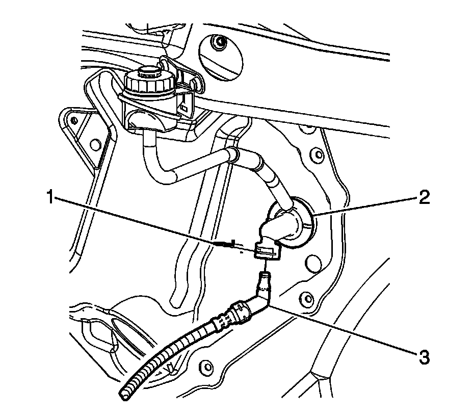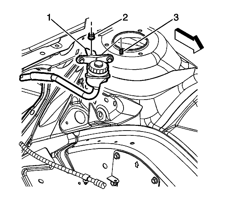 6. Install the clutch fluid reservoir (1) to the strut tower stud (3).