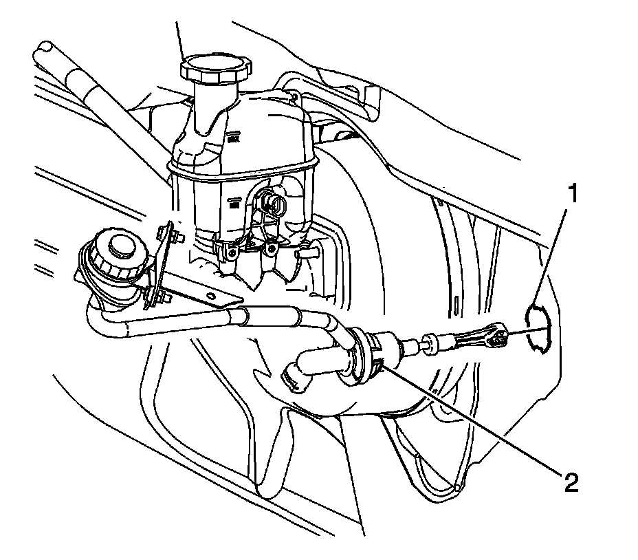 2. Disconnect the clutch master cylinder push rod (1) from the clutch pedal pin (2).