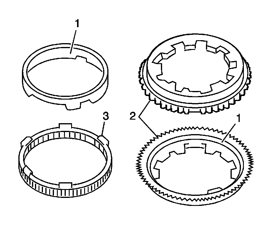 3. Inspect the synchronizer blocker ring lugs (3) for excessive wear.