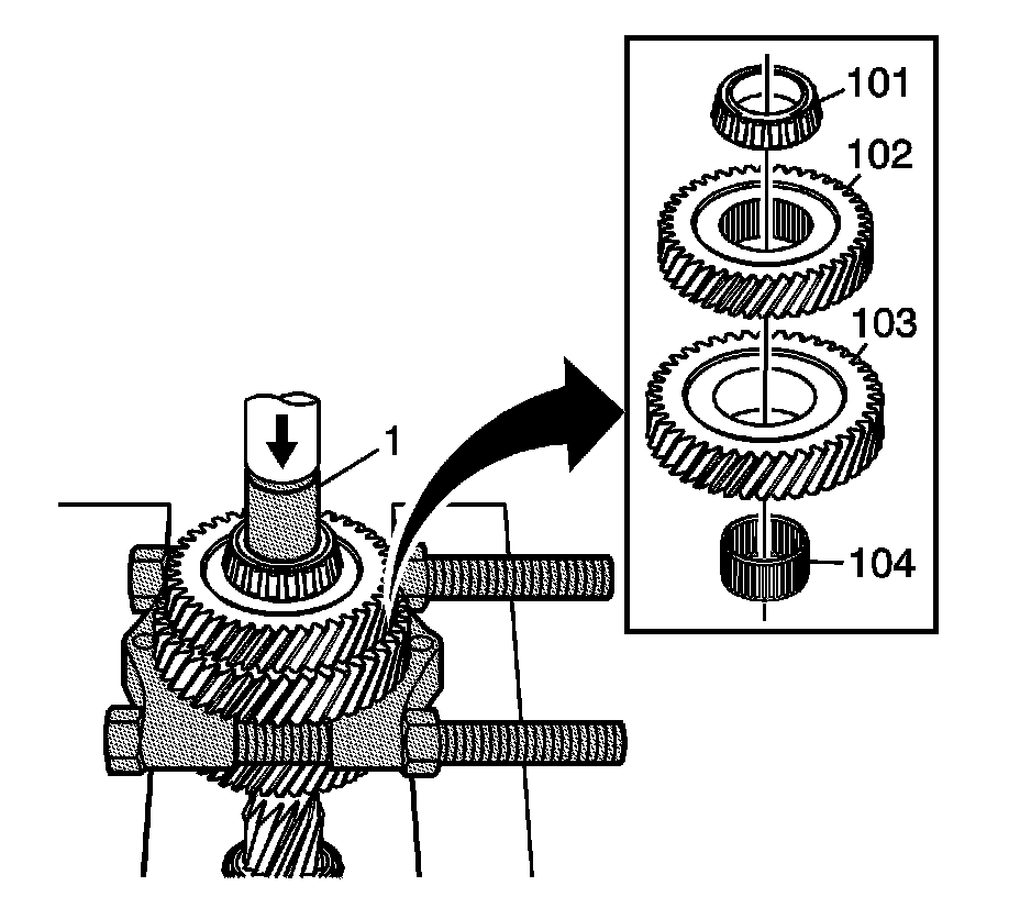 7. Using a press tube (1) and a press plate, remove the 5th gear (105).