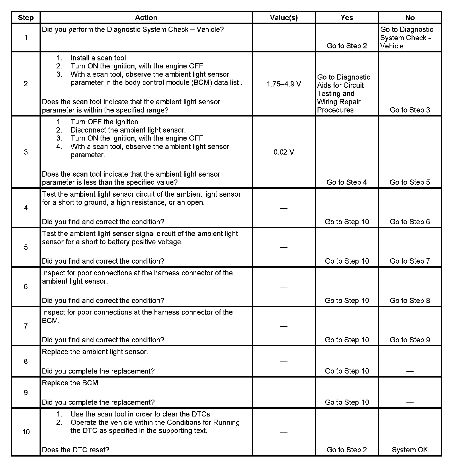 The body control module (BCM) monitors the ambient light sensor signal circuit in order to determine if the daytime running lights (DRL) or the automatic lamp control (ALC) should be turned ON in the AUTO mode. When the BCM senses the ambient light sensor voltage is between 1.75-4.9 volts, either the DRL will be commanded ON or the ALC will be commanded ON.