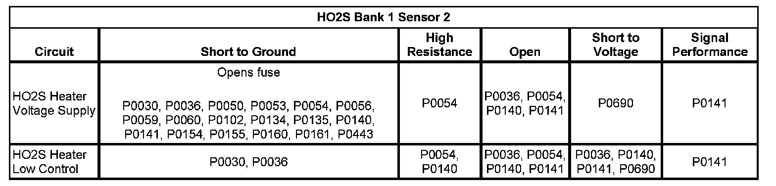 Heated oxygen sensors (HO2S) are used for fuel control and post catalyst monitoring. Each HO2S compares the oxygen content of the surrounding air with the oxygen content in the exhaust stream. The HO2S must reach operating temperature to provide an accurate voltage signal. A heating element inside the HO2S minimizes the time required for the sensor to reach operating temperature. Voltage is provided to the heater by an ignition voltage circuit through a fuse. With the engine running, ground is provided to the heater by the HO2S heater low control circuit, through a low side driver within the engine control module (ECM). The ECM uses pulse width modulation (PWM) to control the HO2S heater operation to maintain a specific HO2S operating temperature range.