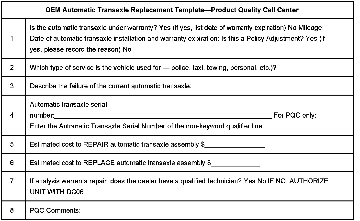 Prior to calling the PQC, complete the OEM Transaxle Exchange worksheet shown in this bulletin.