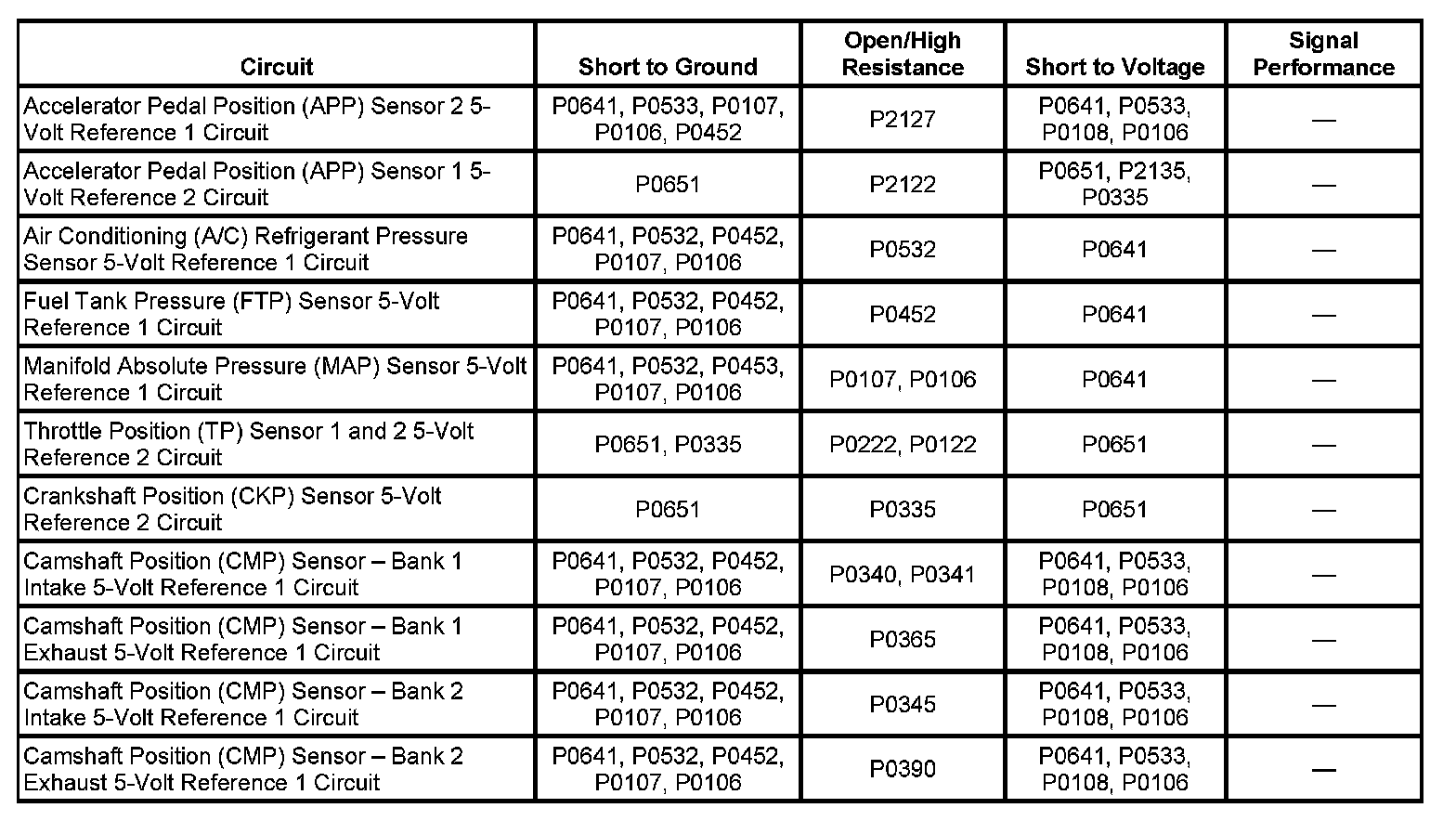 The control module has 2 internal 5-volt reference busses called 5-volt reference 1 and 5-volt reference 2. Each reference bus provides 5-volt reference circuits for more than one sensor. Therefore, a fault condition on one 5-volt reference circuit will affect the other 5-volt reference circuits connected to that reference bus. The control module monitors the voltage on the 5-volt reference busses.