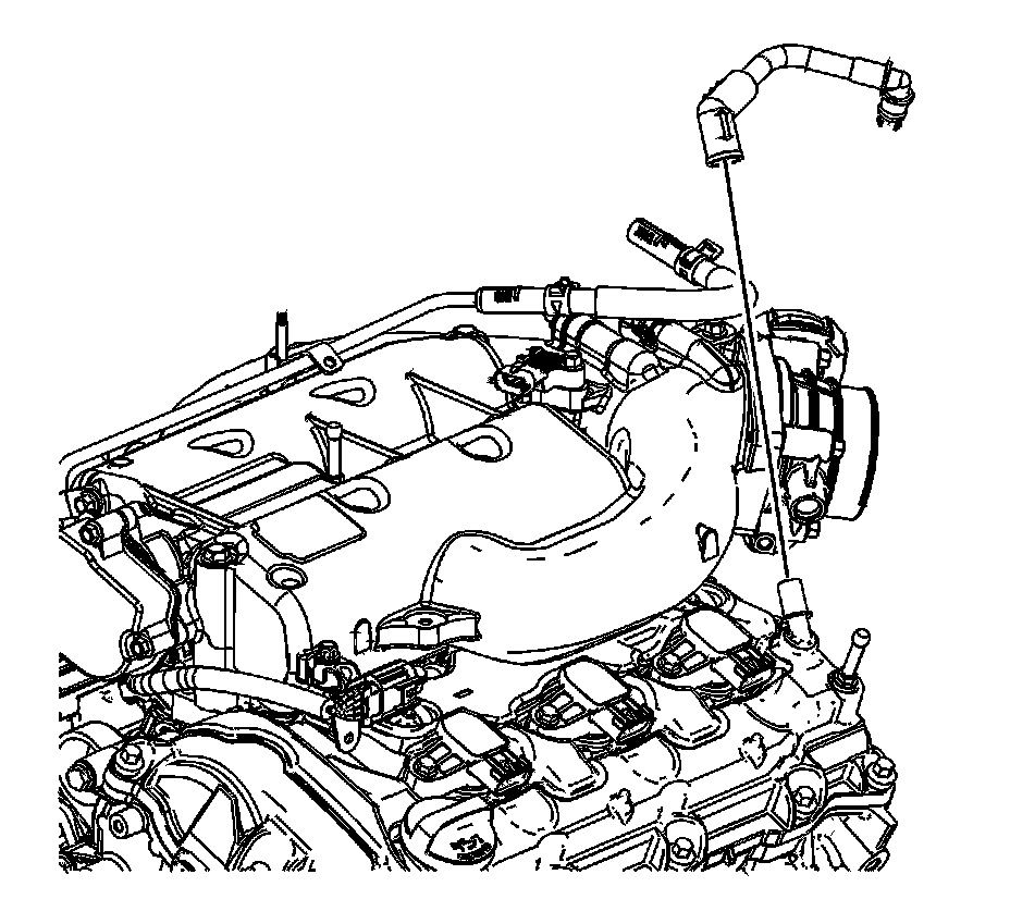 8. Install and connect the dirty air positive crankcase ventilation (PCV) hose to the intake manifold and to the right camshaft cover fitting.