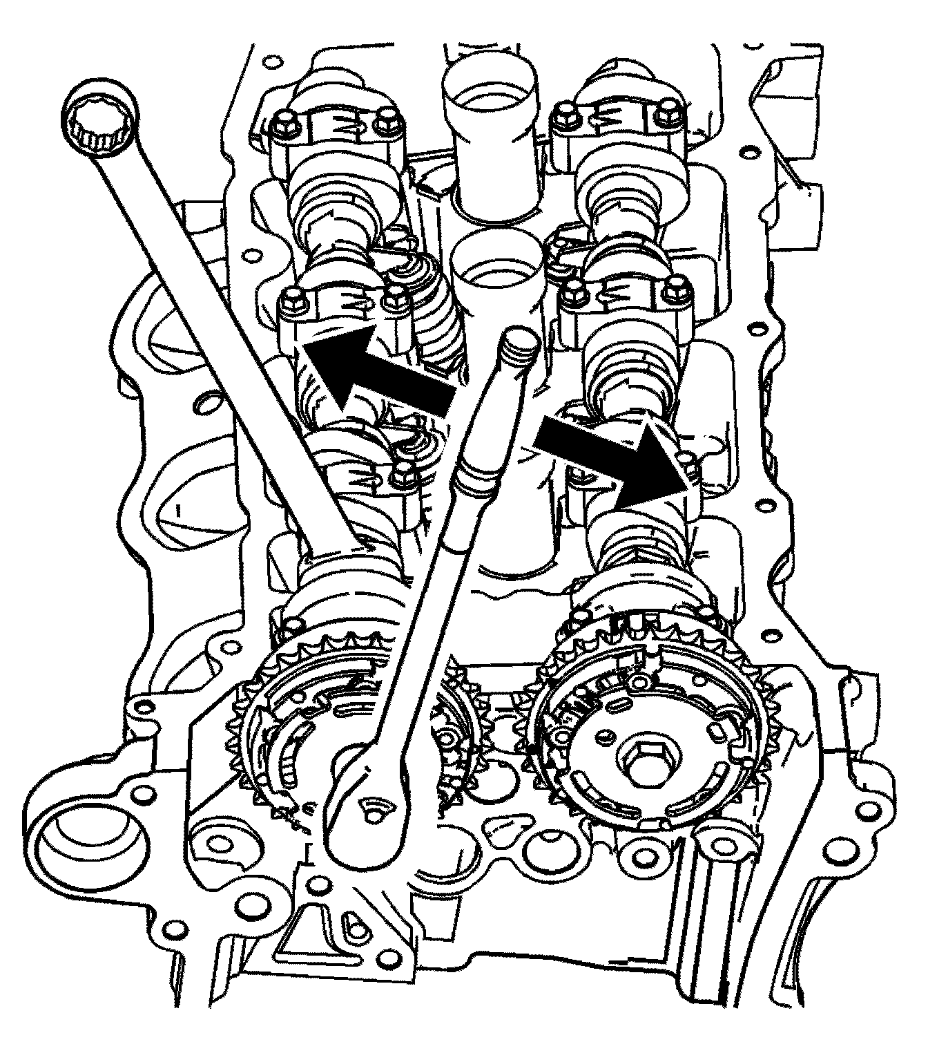 Notice: A wrench must be used on the hex of the camshaft when loosening or tightening in order to prevent component damage. Failure to prevent the torque reaction against the timing drive chain can lead to timing drive chain failure.