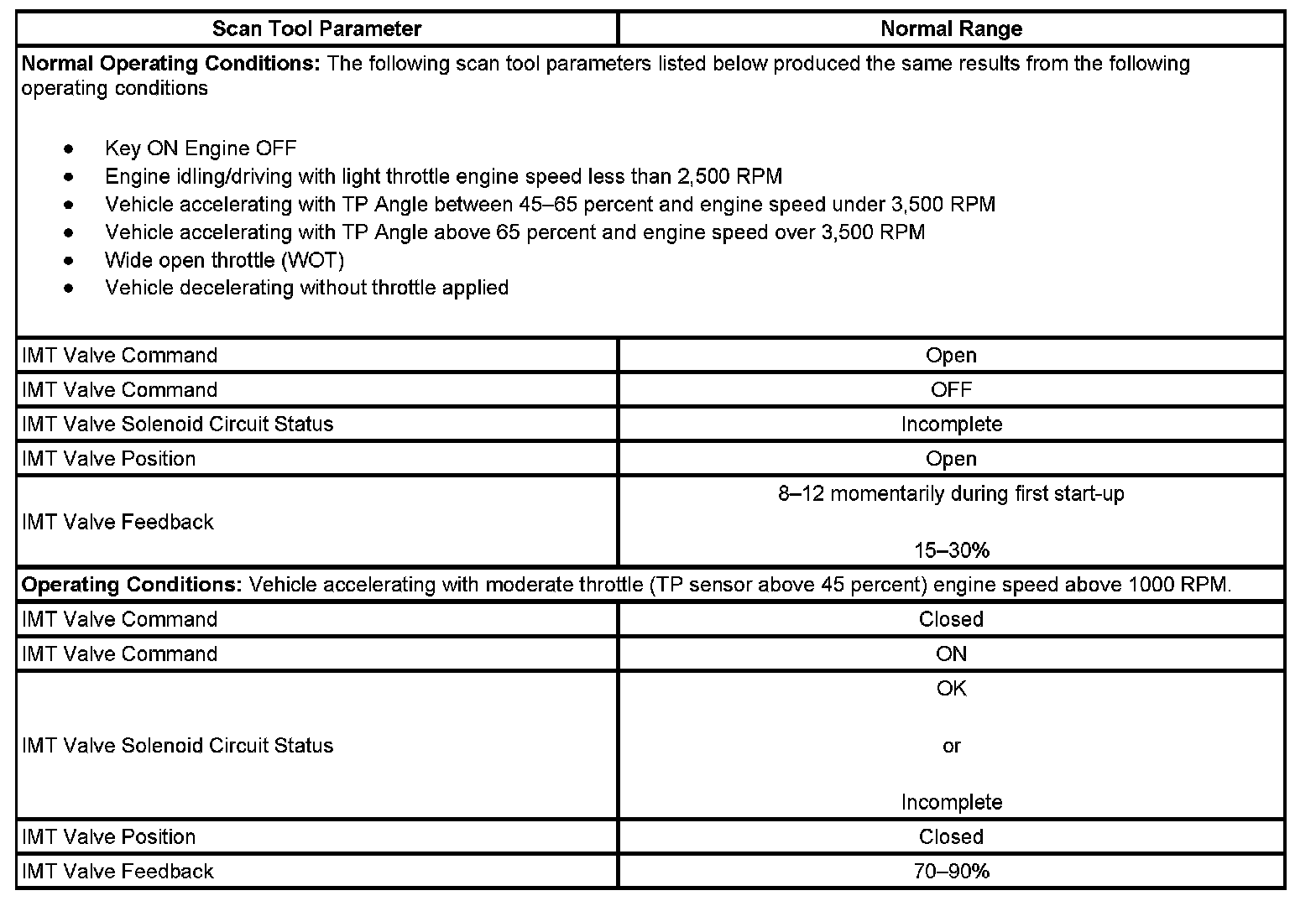 The intake manifold tuning (IMT) valve system uses variable air induction tuning in order to achieve maximum performance and efficiency over the entire operating range of the engine. The characteristic torque curve of a normally aspirated engine depends mainly on how the engines average pressure changes over the engine speed range. The average pressure is proportional to the volume of the air mass present in the cylinder when the inlet valve is closed. The design of the inlet system determines how large an air mass can be drawn into a cylinder at a given engine speed. An IMT valve is used to change the intake manifold plenum configuration. When the IMT valve is open, the intake manifold is configured to one large plenum. When the IMT valve is closed, the intake manifold is configured to 2 smaller plenums. The 2 intake manifold plenum sizes result in different torque curves, which improves performance at low and high engine speeds. During low speed, high load conditions the IMT valve is closed creating a longer runner path inside the plenum, which increases torque. During higher engine speeds and loads, the IMT valve opens creating a shorter runner path inside the plenum, which increases horsepower.