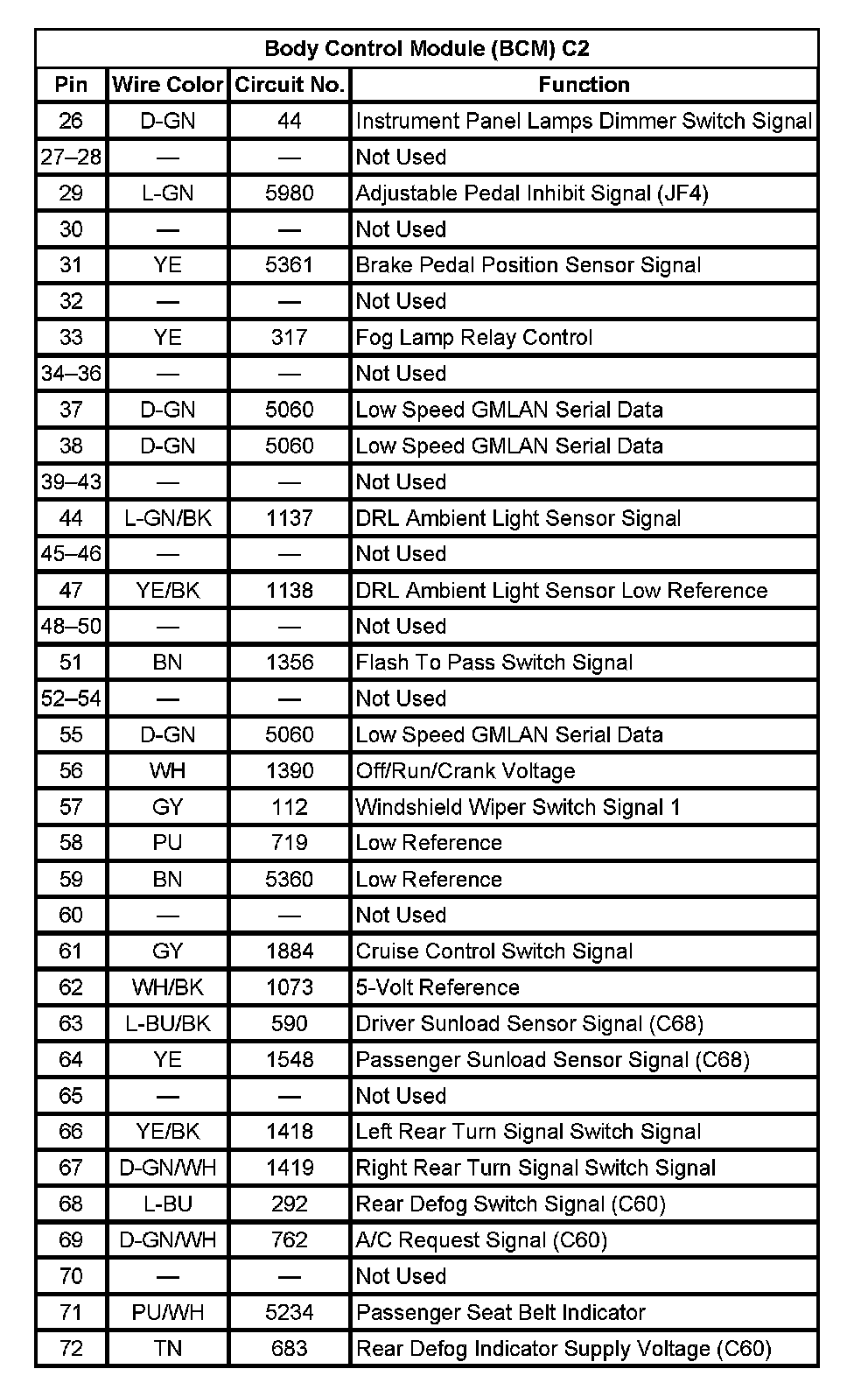 Body Control Module (BCM) C2 (Pin 26 To 72):