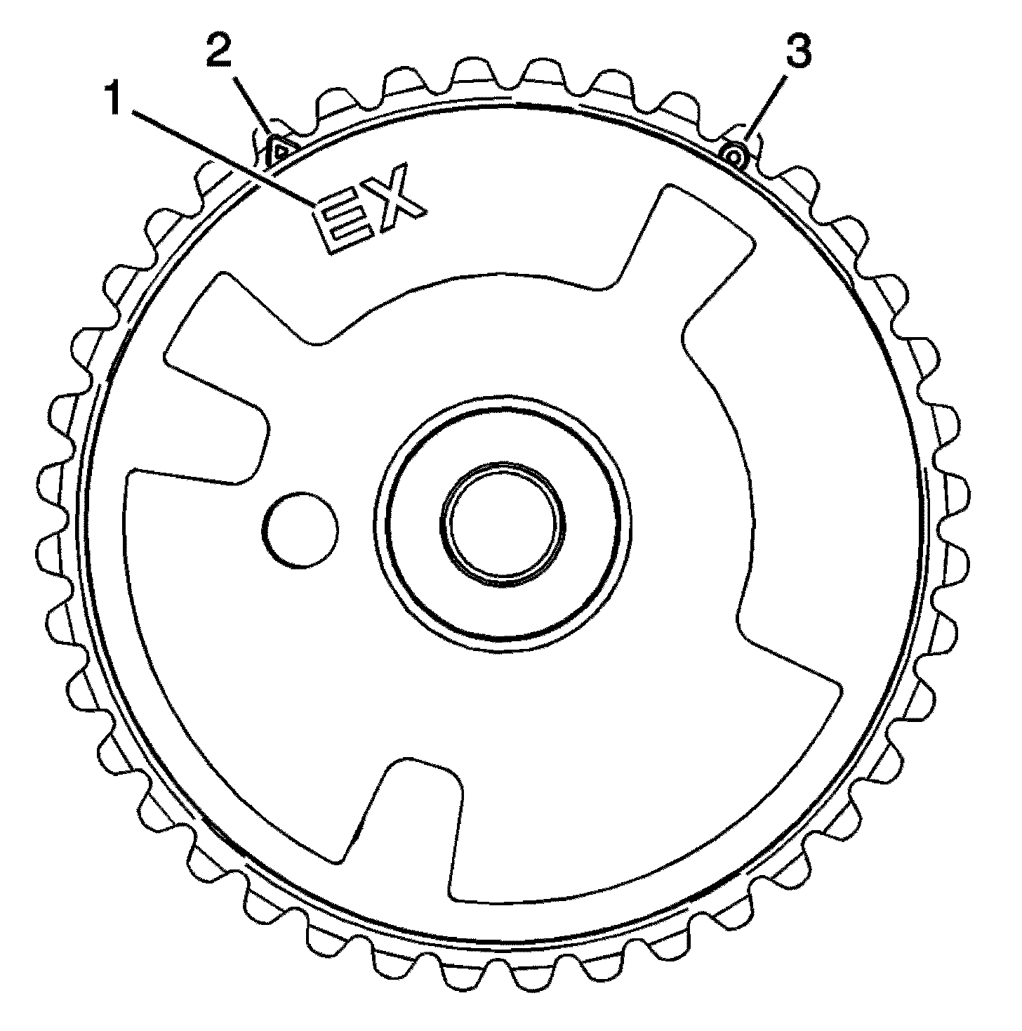 1. Ensure the proper camshaft position actuator is installed. Observe the body of the camshaft position actuator for the EX marking (1). The marking is for an exhaust camshaft position actuator.