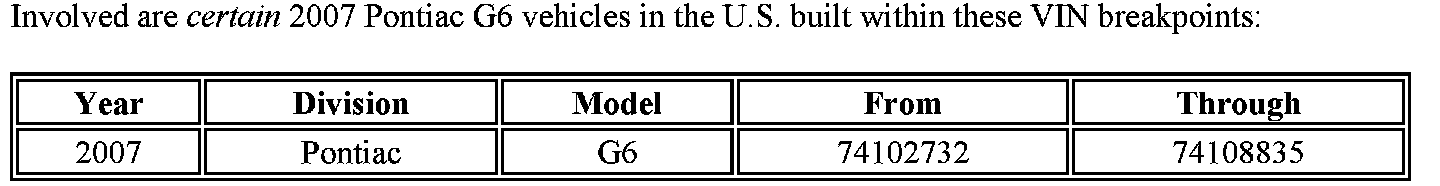 Involved are certain 2007 Pontiac G6 vehicles in the U.S. built within the VIN breakpoints shown.