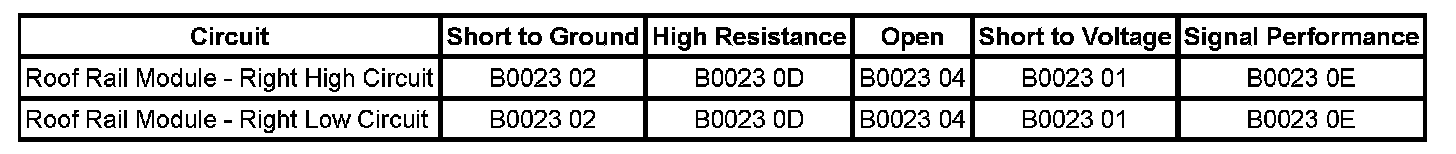 The roof rail module - right high and/or low circuit is short to voltage for 120 milliseconds.