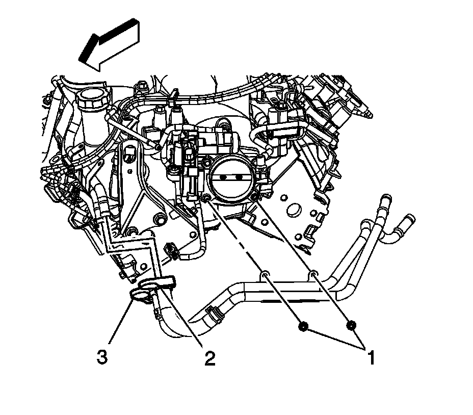 24. Remove the heater inlet and outlet pipe nuts (1) from the throttle body studs.